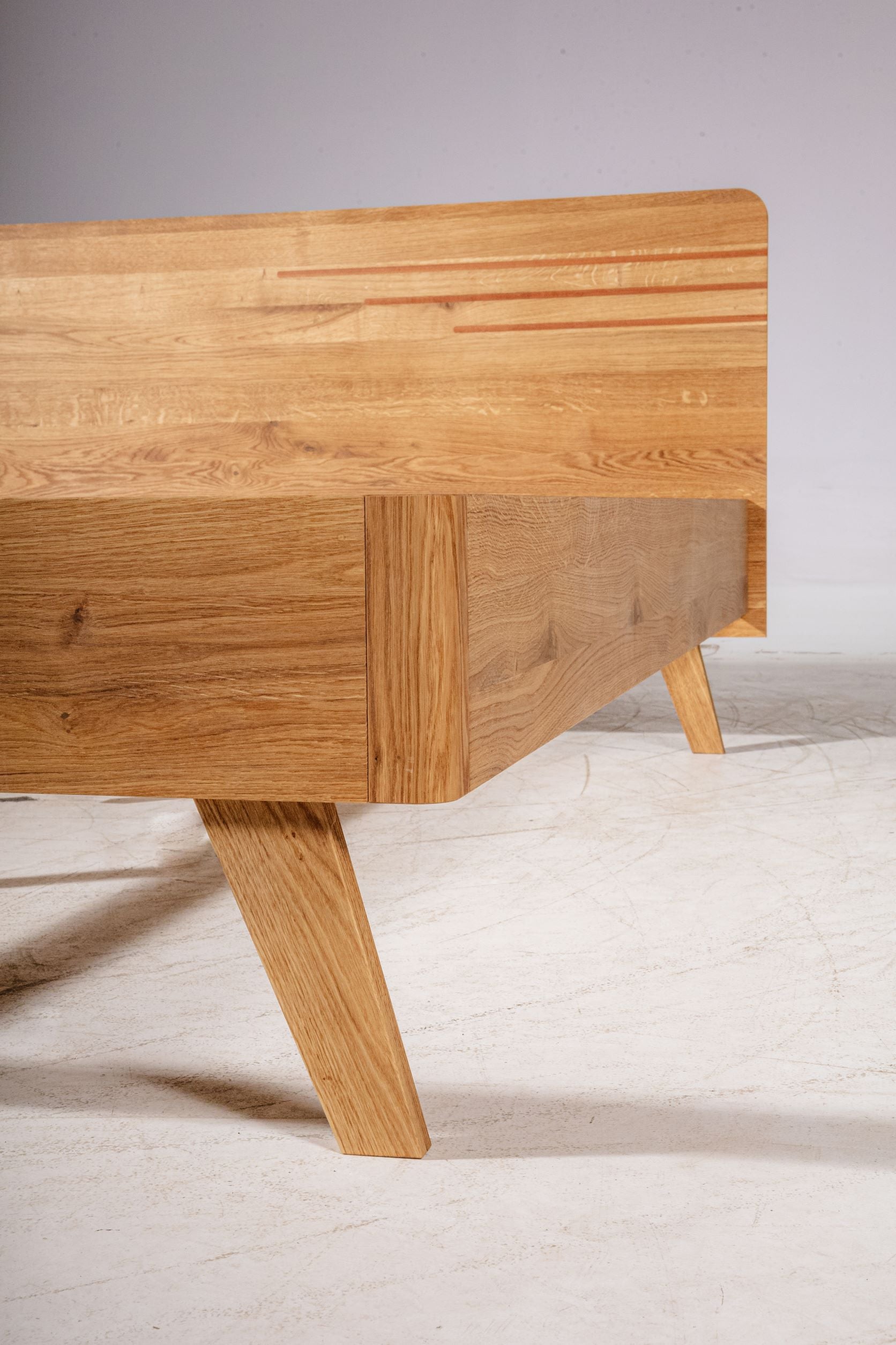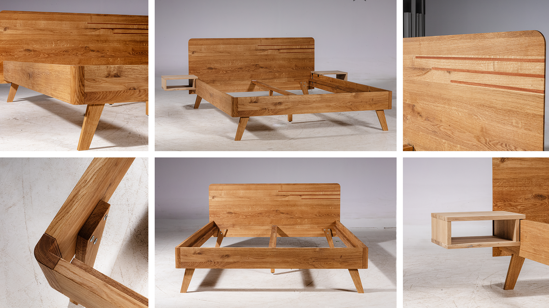 Rankų darbo ąžuolinė lova su riešutmedžio akcentais