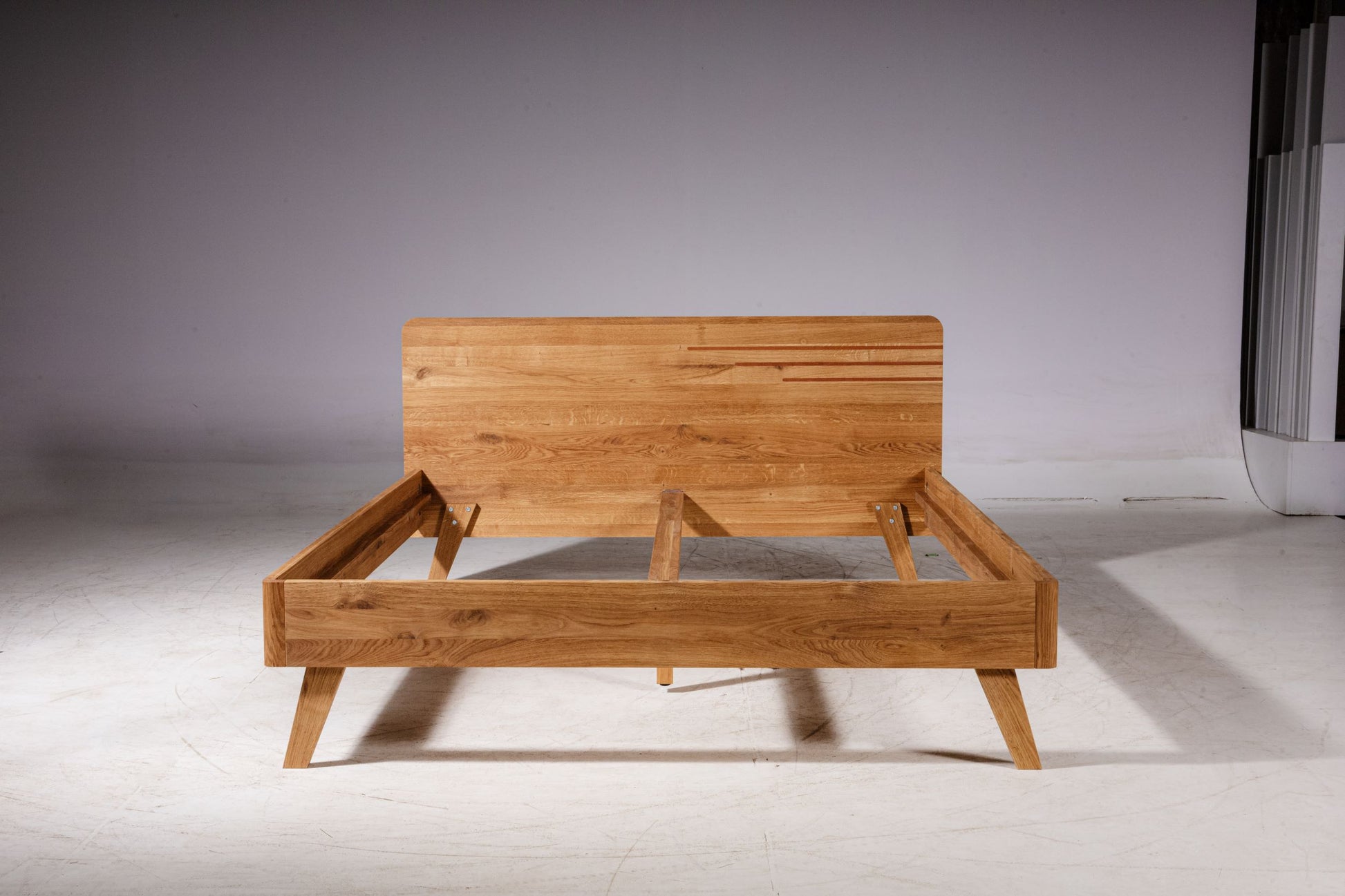 Ši minimalistinio dizaino lova yra pagaminta iš ąžuolo masyvo, kuris išsiskiria savo tvirtumu ir natūraliu raštu. Galvūgalį puošia trys subtilios horizontalios riešutmedžio juostelės – jos suteikia baldui išskirtinumo ir elegancijos.